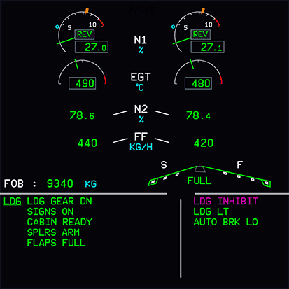 The upper ECAM should now show the engines in reverse mode (REV) and the lower ECAM shows the Speed Brakes (spoiler) deployed. Also, you should notice that the brakes actually get hotter.