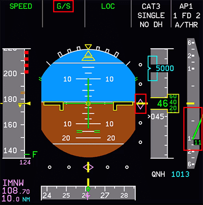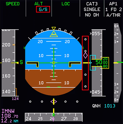 The aircraft will start descending when the deviation marker is in the middle (we have captured the ILS glideslope). The vertical FMA will now display G/S in green.
