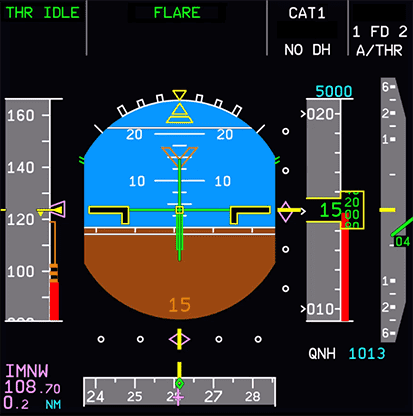 At the runway threshold we should be about 50ft above ground and prepare to set the thrust levers to idle and flare.