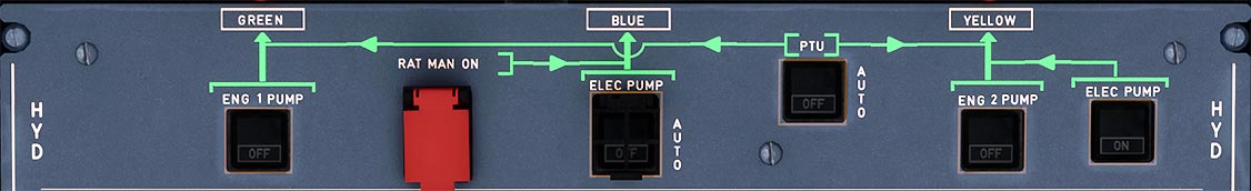 - Amber light and ECAM caution appears, if the green or the yellow reservoir overheat, have low air pressure or have a low fluid level. It goes out, when the crew selects OFF, except during an overheat, where it stays on as long as the overheat lasts.