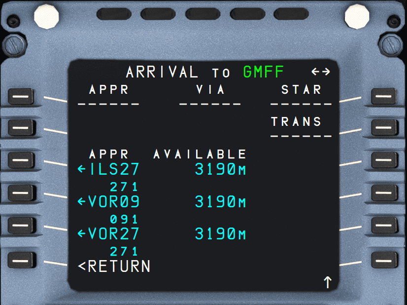 - These fields list selectable and selected APPRs, STARs, and VIAs. The flight crew can scroll the pages, when necessary. Selectable APPRs, STARs, and VIAs are displayed in blue with an arrow.